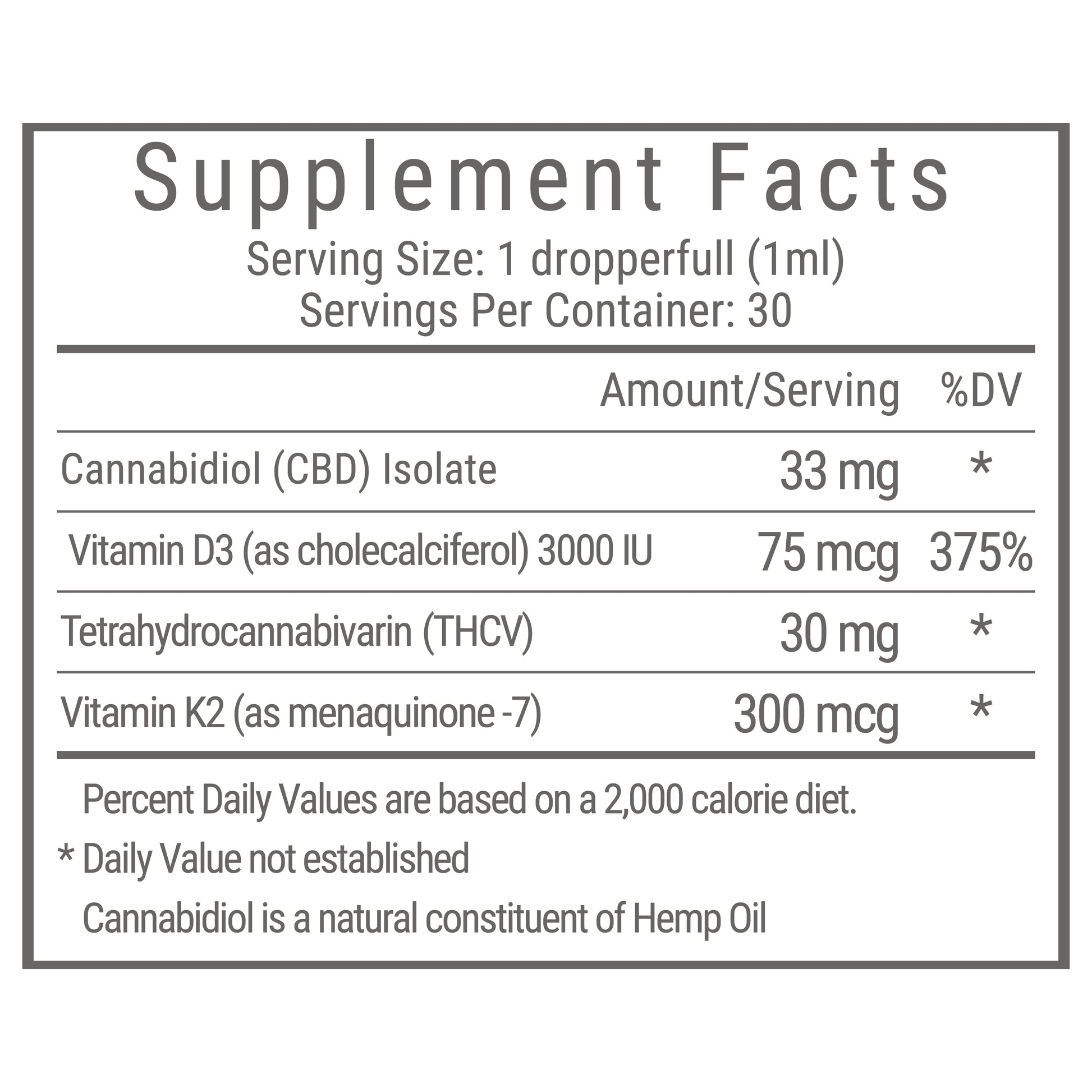 This powerful oil combines THCV, CBD, Vitamin D, and K2 to naturally promote balance and wellness. Designed to fit seamlessly into your daily routine.